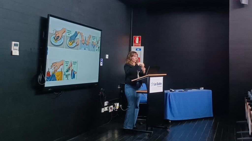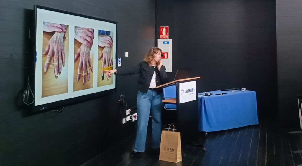 La ponente presentó las claves de una intervención basada en la evidencia, destacando aquellas estrategias respaldadas por la literatura científica, como la educación en protección articular y economía articular, el uso de ortesis para la estabilización del pulgar, el ejercicio terapéutico orientado a la mejora de la movilidad y la fuerza, así como el entrenamiento en actividades significativas y la recomendación de productos de apoyo.