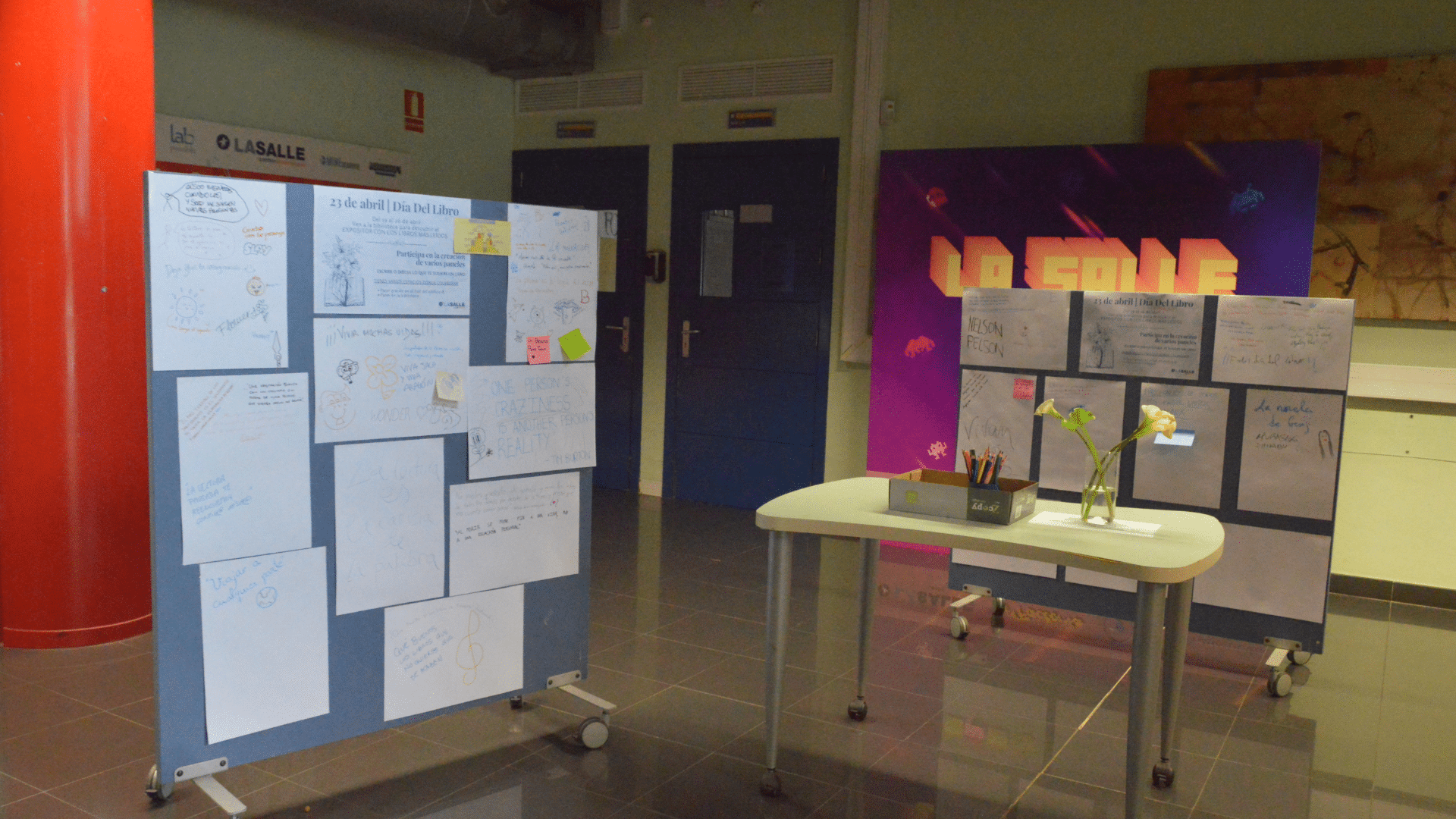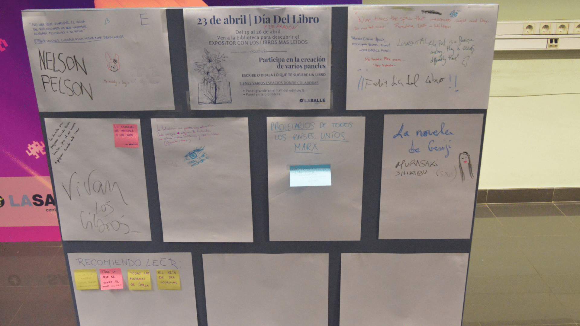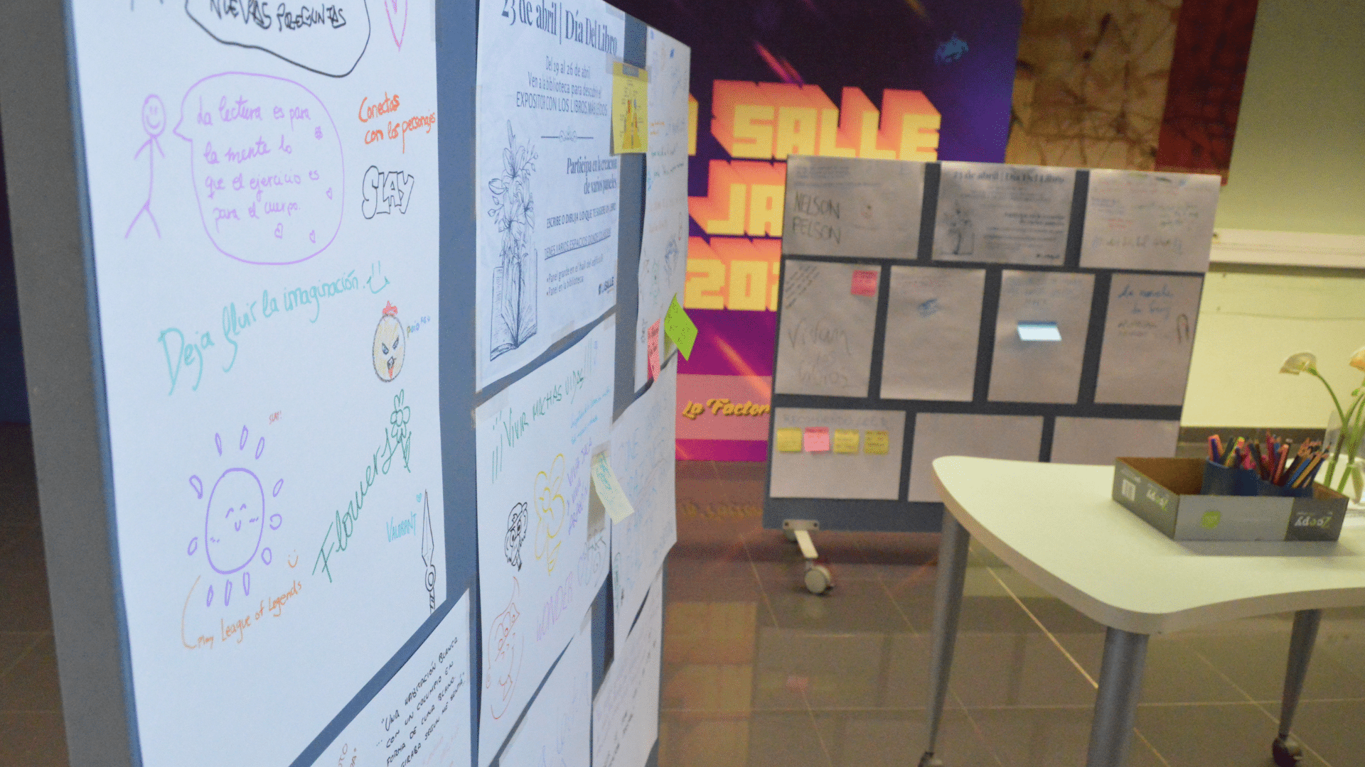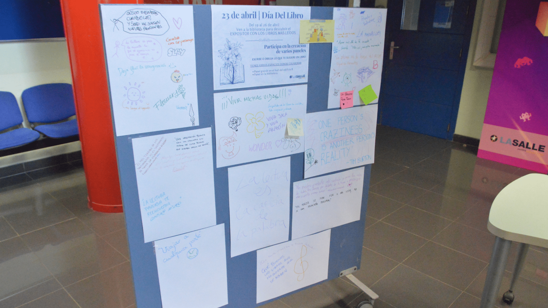 Además, se diseñó una actividad interactiva para que todos los participantes se convirtieran en protagonistas de esta celebración. Se instalaron dos paneles en lugares estratégicos del campus, donde podían plasmar sus ideas, reflexiones, dibujos o cualquier otra expresión artística que los libros les inspiraran. Estos paneles se encontraban en el Hall del Edificio B y en la Biblioteca, lugares de gran afluencia para fomentar la participación de todos los miembros de La Salle Centro Universitario.