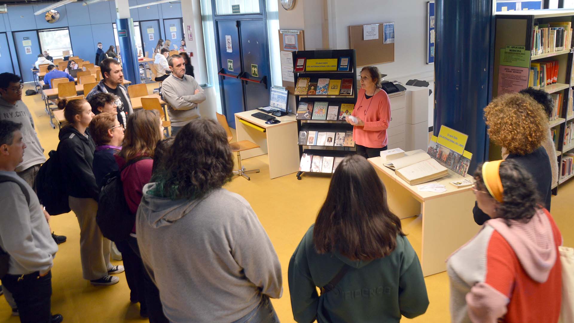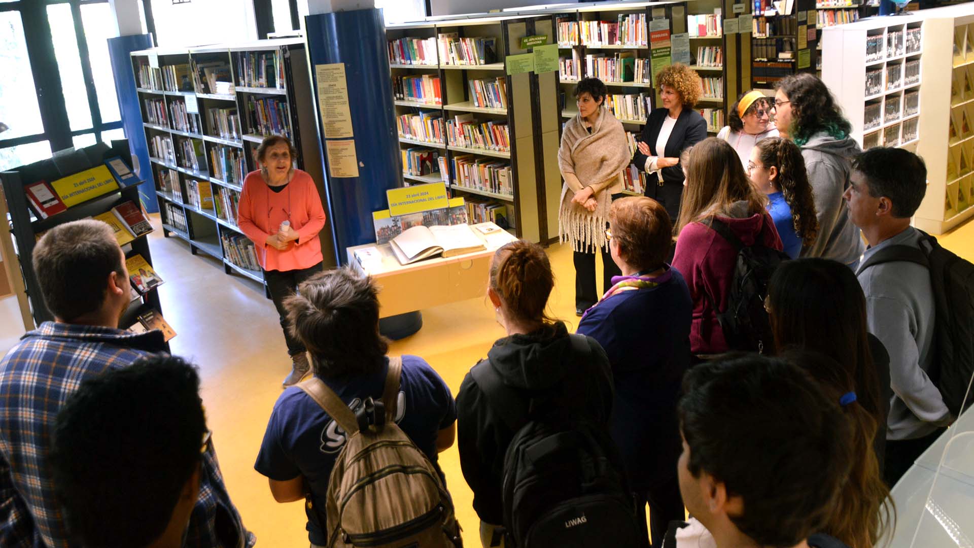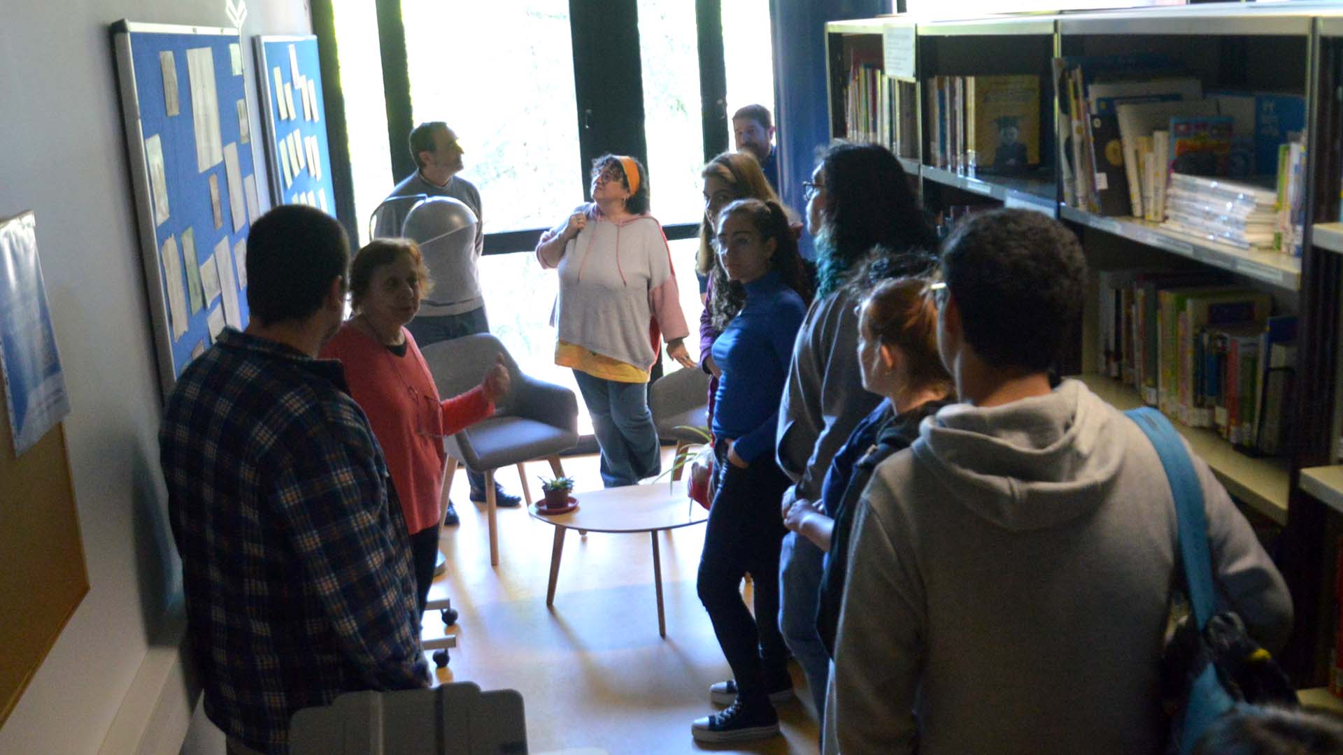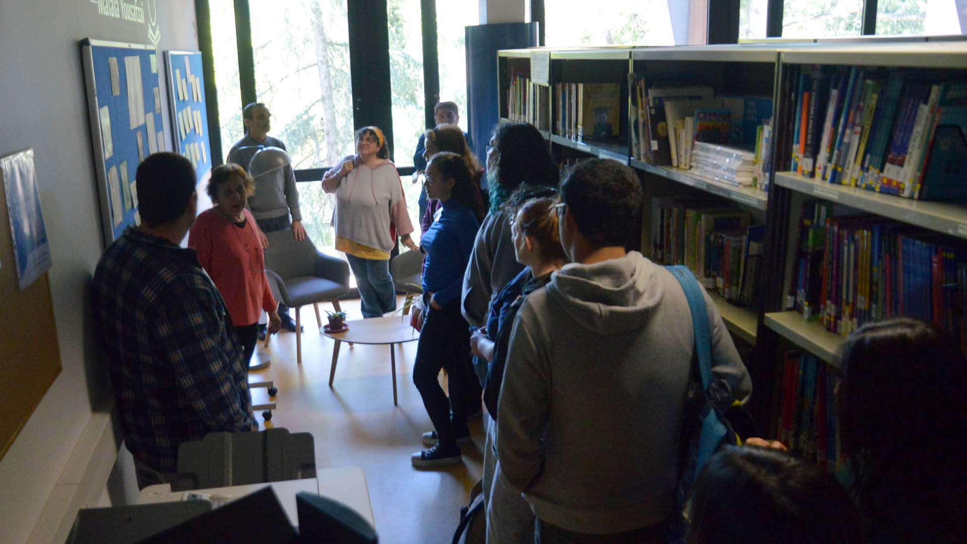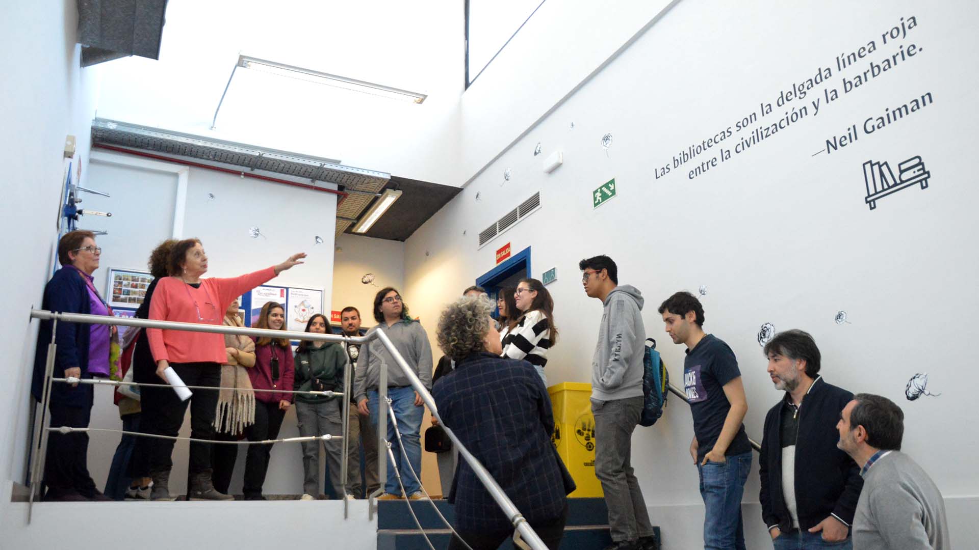 El hall del primer piso, fue el punto de encuentro para todos los participantes. Tras un breve recorrido hasta la biblioteca, se pudieron apreciar los nuevos vinilos adornando las paredes de las escaleras, con frases conmemorativas que exaltaban la importancia de los libros y las bibliotecas en la historia y el arte.