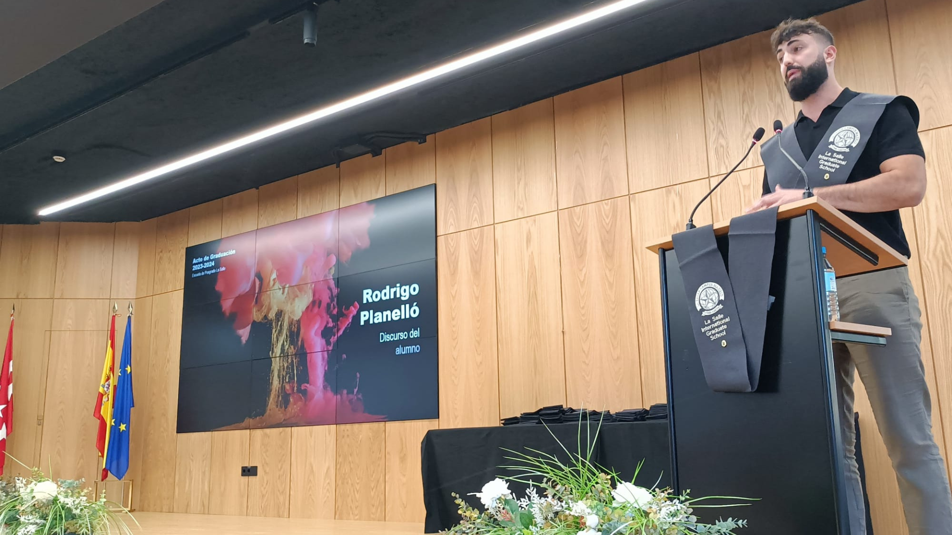 El acto culminó con una emotiva charla del alumno del Máster en Fisioterapia, D. Rodrigo Planelló San Segundo. En representación de todos sus compañeros, Rodrigo compartió anécdotas y recuerdos que han marcado su experiencia de aprendizaje.