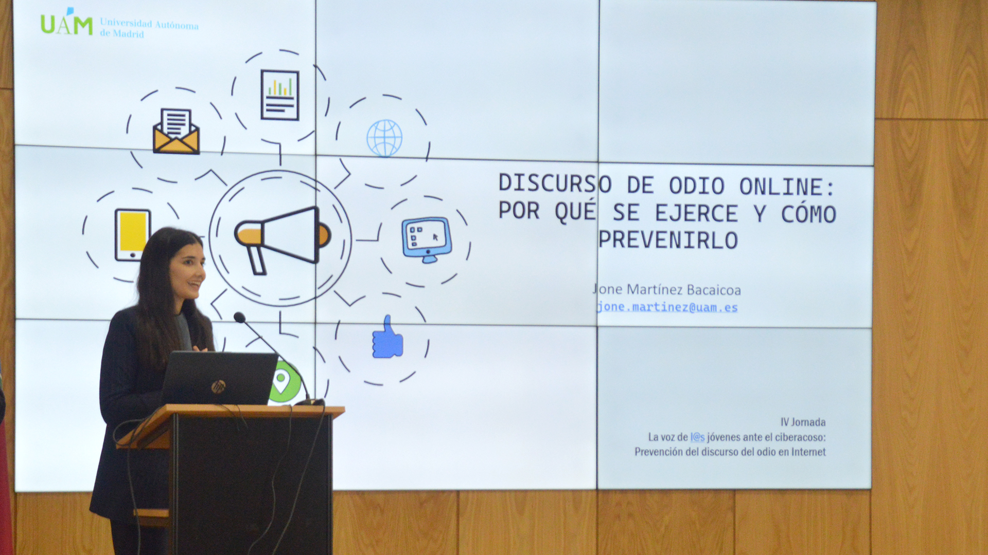 A continuación, se llevó a cabo la Mesa de expertas: «Jóvenes y discursos del odio», en la que Nuria Hernández Sellés y Óscar Arteaga González, responsables de la Factoría Transmedia y profesores del Grado Universitario de Narrativa Transmedia, abordaron el Ziberacoso en la cultura de la Hiperconexión y el FOMO. Trataron la relación entre el amor y el odio en las redes sociales y la importancia de comprender la forma en que la Generación Z utiliza las redes para, a través del entendimiento, prevenir el acoso. Posteriormente, Jone Martínez-Bacaicoa, psicóloga (UAM), profundizó en cómo las manifestaciones de odio en internet hacen que el discurso sea más visible y normalizan actitudes intolerantes, pero también abordó formas de prevenir estas actitudes.